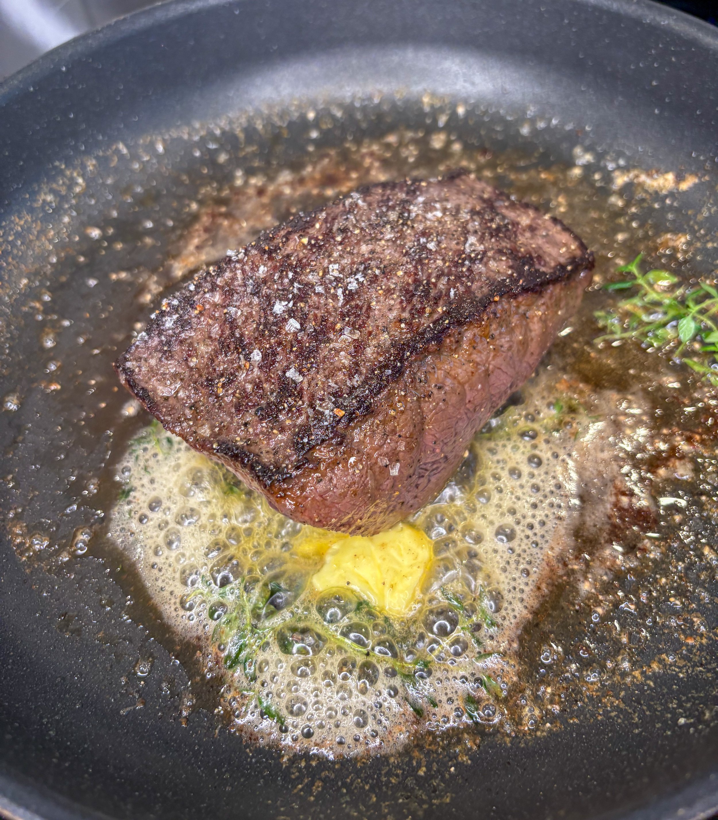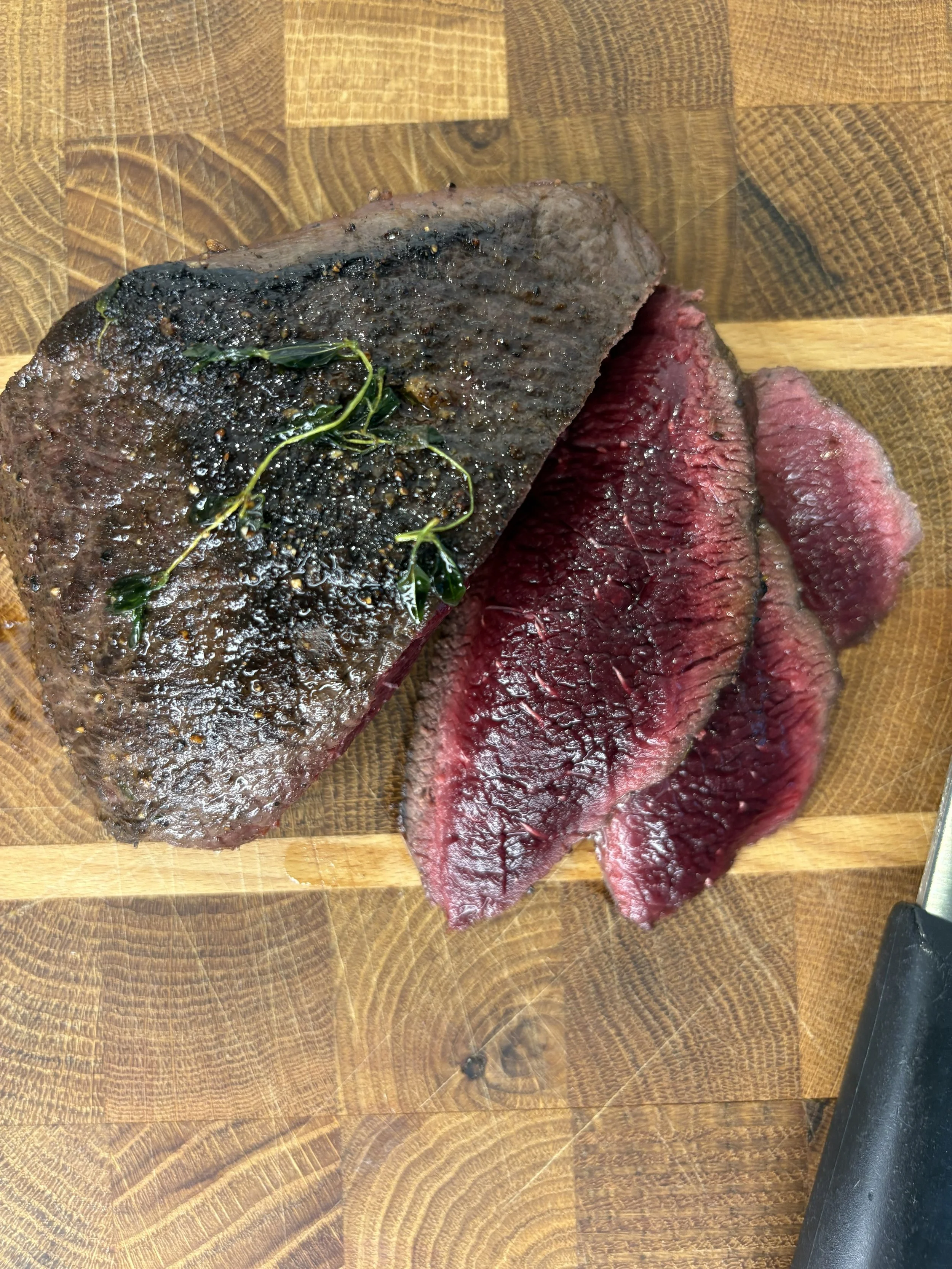Stek hvalbiffen: La biffen ligge på kjøkkenbenken slik at den ikke er kald når du legger den i panna. Tørk godt av med et kjøkkenpapir. Krydre kjøttet med salt og pepper. Varm opp en blanding av smør og olje i en varm panne, og stek biffene 1–2 minutter på hver side på høy varme – de skal ha en rød kjerne. Steketid varierer ut i fra størrelsen på kjøttstykket, og personlig preferanse. La kjøttet hvile noen minutter før du skjærer det i skiver.